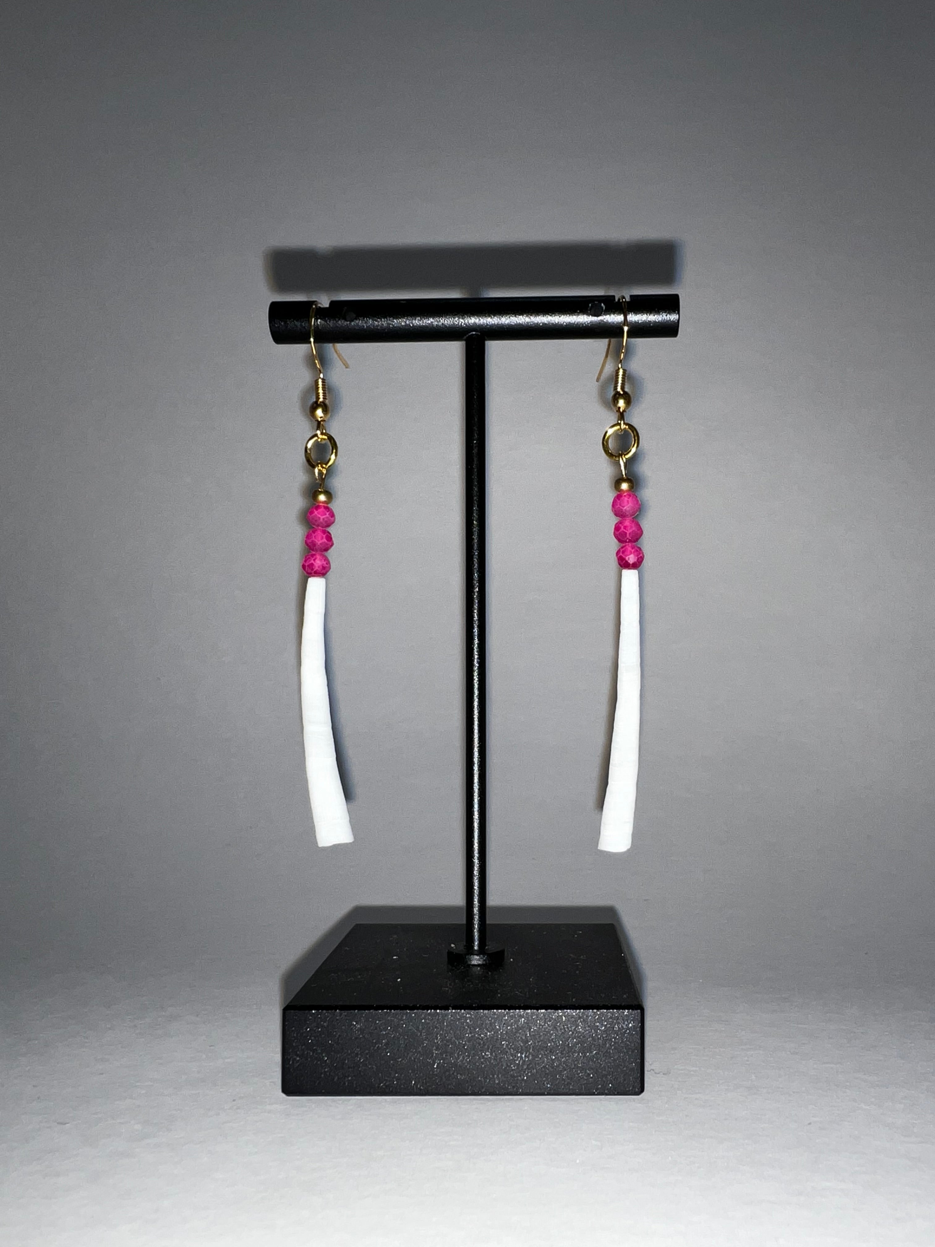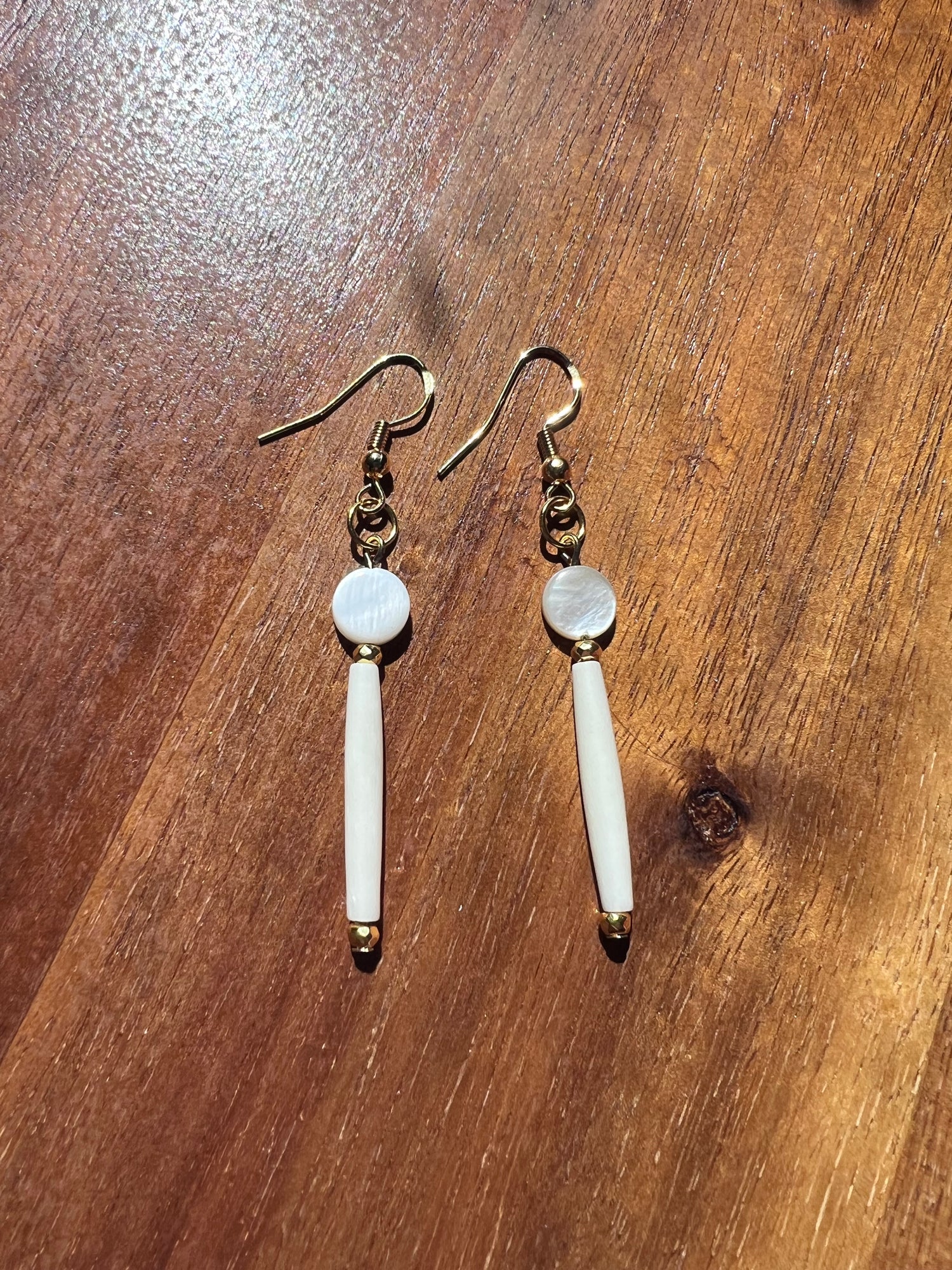 Handmade white bead dangle earrings with round shell beads and sleek tapered drops, finished with 18K Gold hooks for a timeless look.